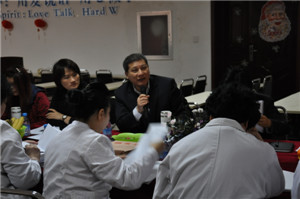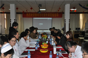 后,在医院五楼多媒体会议厅内,考察团人员与院领导、各病区主任医师、门诊医师、各病区护士长等相关人员进行终的详细讨论。参会人员还一起观看了由台湾医师团带来的医疗视频。张胜利博士对视频中出现的一些治疗和护理知识提出了自己的观点,并指出一些护理和治疗中常见的错误,避免医院各部门人员在实际情况中出现此类问题。