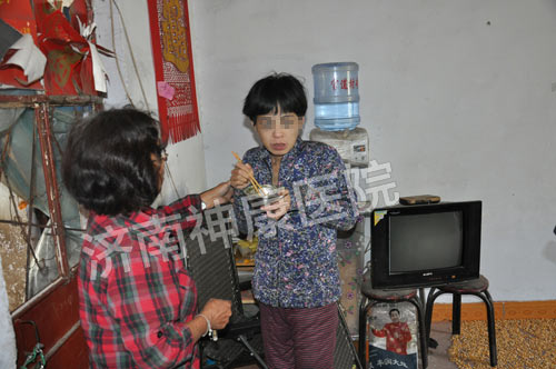 当天下午,济南神康医院资深精神疾病医师马增来主任在神康救助小组的陪同下来到了胡丽萍家中,打开胡丽萍的房间,映入笔者眼帘的除了满屋的狼藉以外便是体型消瘦,有着大大黑眼圈的胡丽萍,在见到我们那一刻起,胡丽萍嘴里就一直在不停的自言自语着,且时而大笑,时而哭泣,并用抵触的眼神看着我们。经马主任诊断,胡丽萍为典型“精神分裂症”。经了解,因为家庭条件所限,胡丽萍没有接受过任何正规、系统化的治疗,平时的病情都是靠药店里面买的抗精神药控制。考虑到胡丽萍的家庭情况及病情,马主任决定带其回医院接受系统化的治疗,且免去其所有的治疗费用。
